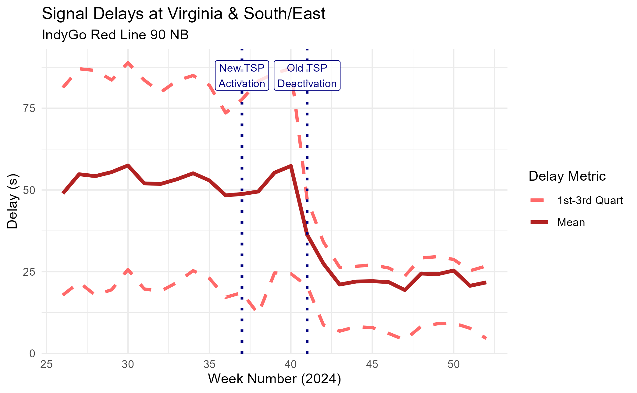 We can see a pretty cool trend: as the signal transitioned into the new TSP system, the average signal delay fell dramatically. The 75th percentile – representing a “slow” trip – saw an even larger improvement.