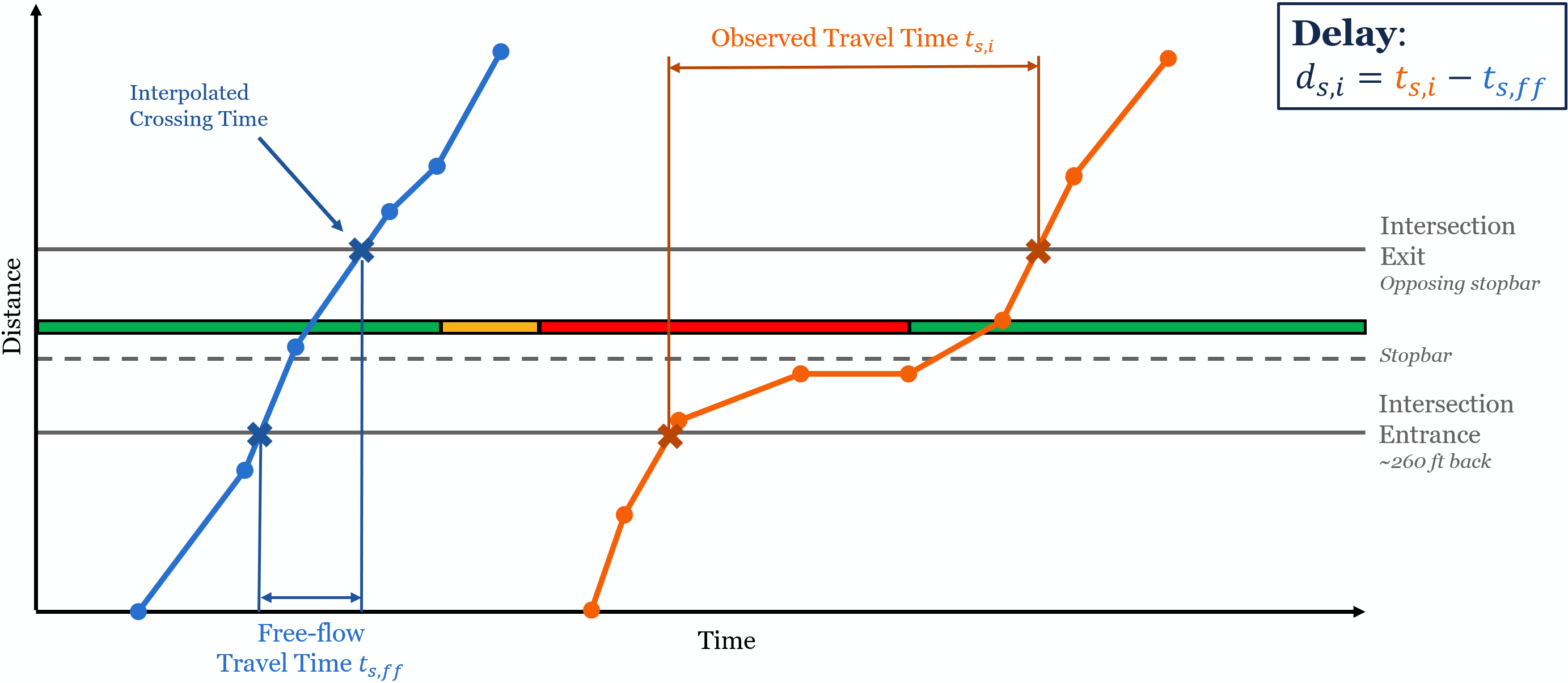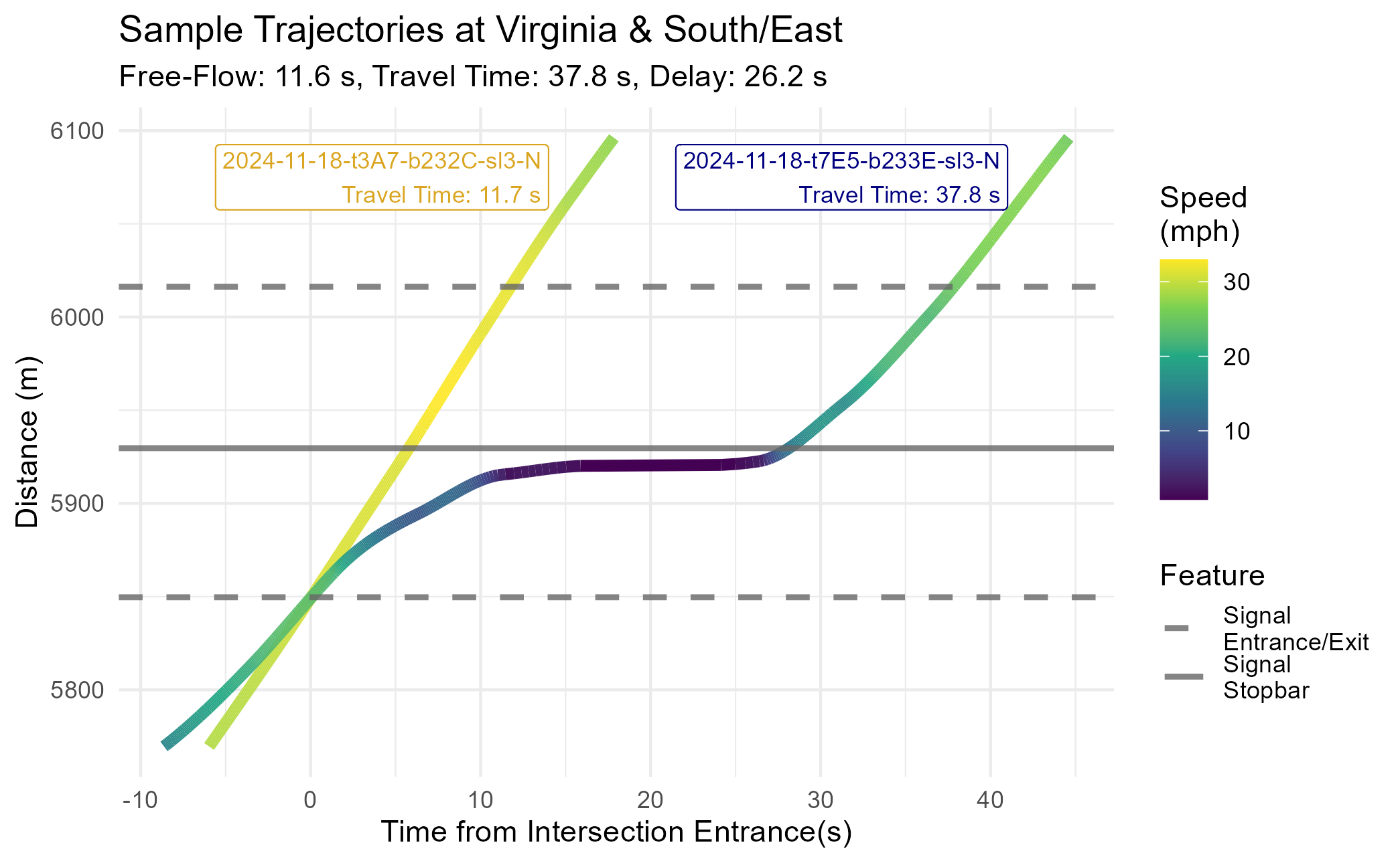 This almost perfectly matches the theoretical diagram we presented above. The free-flow trajectory (the 5th percentile of all travel times at this signal) is a straight line traveling near the speed limit. The high-delay trajectory (the 75th percentile of all travel times at this signal) comes to a stop just ahead of the stopbar before proceeding. Between the stopped period and necessary acceleration/deceleration, this vehicle experienced roughly 26 seconds of delay.
