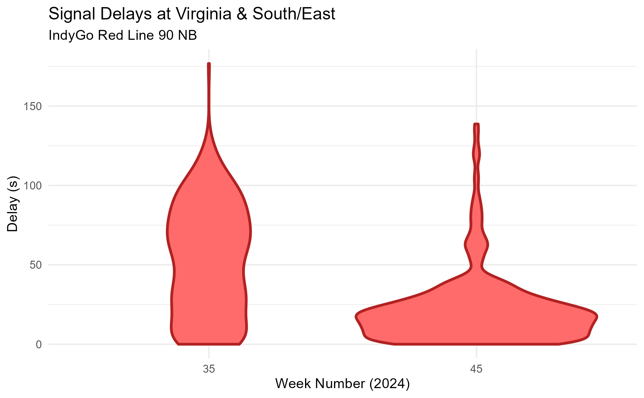 To better visualize how the distribution of signal delays changed, we’ll go back to our point observations (not grouped by week) and make violin plots for two representative weeks: week 35, with the old system, and week 45, with the new system.