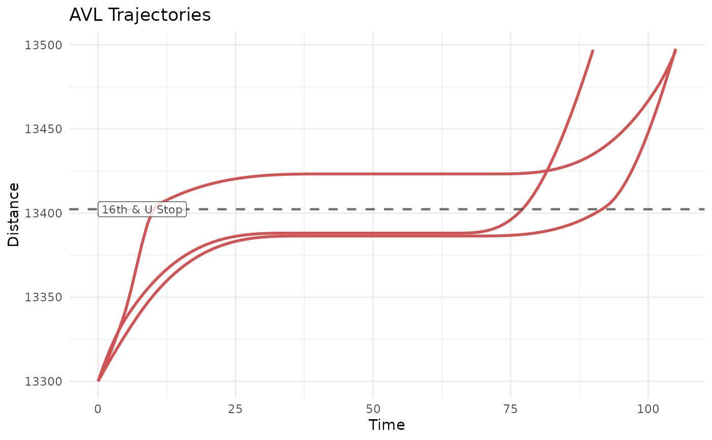 distance_dfof TIDES AVL data. This will use the distance and time point pairs for plotting, and draw linearly between them. This will look similar to a plot usingtrajectorywhen zoomed out. It is most useful if you want to map formatting to attributes other thantrip_id_performed, such as a vehicle or operator ID. If starting with atrajectory, but the additional control over formatting is desired, consider usingpredict()to generate distance and time points to plot, then joining the desired attributes to thetrip_id_performedcolumn.